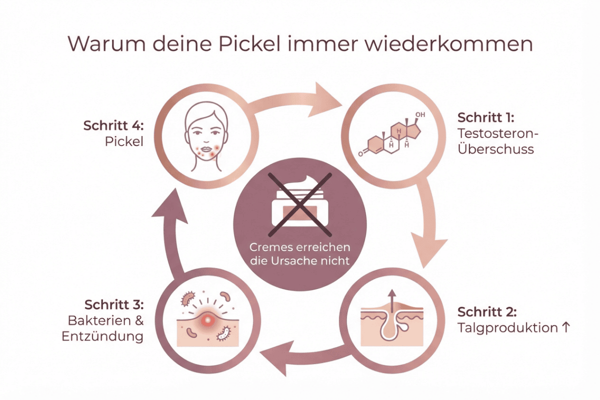 Dein Körper produziert zu viel Testosteron. Ja, auch Frauen haben Testosteron – und wenn es aus dem Gleichgewicht gerät, setzt es eine Kettenreaktion in Gang, gegen die keine Creme der Welt eine Chance hat: