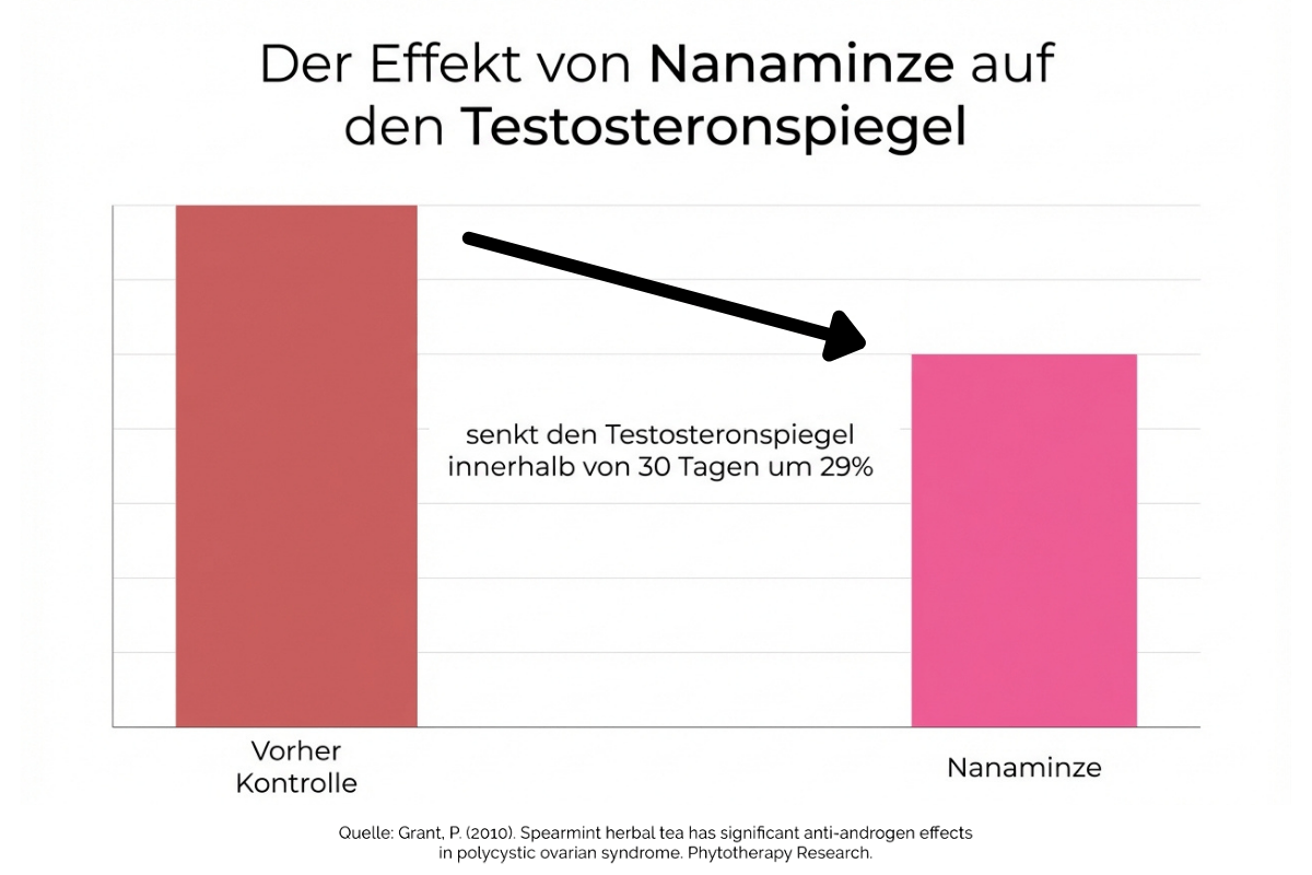 In zwei klinischen Studien – speziell an Frauen – wurde nachgewiesen, dass Nanaminze den Testosteronspiegel innerhalb von 30 Tagen um 29% senken kann [1].